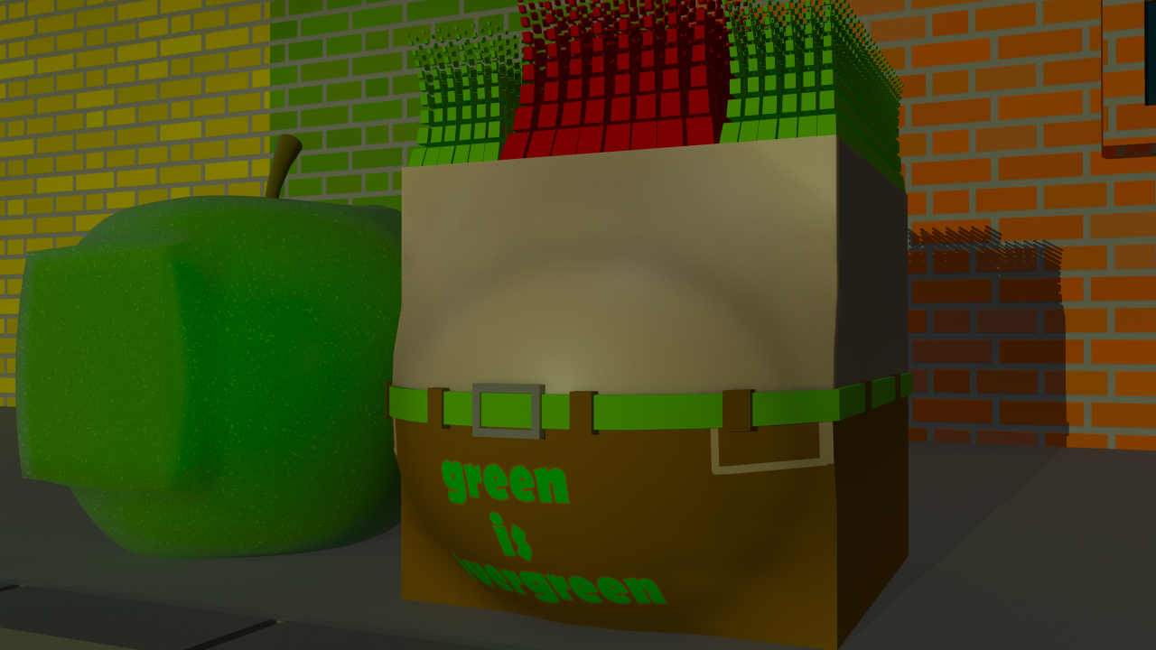 A physical and spiritual ideal has been created, which states: "Cube is the ideal shape of reality". The standard. The measure. Technology sculpts all objects but also plants, animals and the planet Earth in the form of a cube. Even humans are cube shaped. And everything fits perfectly. Without discrimination. But without positive discrimination either. Without vitality. Everything is perfect, but at the same time absurdly identical. And then, around green appleappears out of nowhere. And between the cubic and rounded form love is born. And life has a chance again.